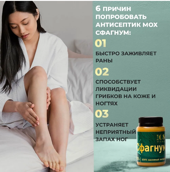 Мох сфагнум успешно борется с такими дерматологическими проблемами как псориаз, экзема, дерматит, фурункулез и т.п. Мощное противогрибковое действие мази позволяет за короткое время избавиться от грибка ногтей на ногах, на коже, а также отличное средство от запаха ног и повышенного потоотделения.