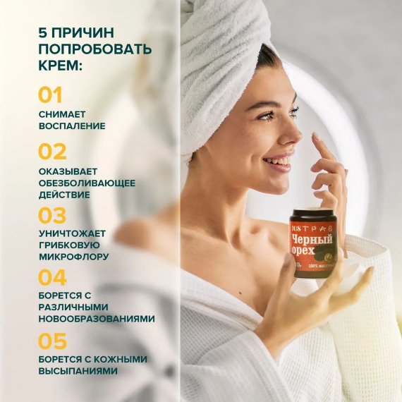 Крем для тела с экстрактом черного ореха борется с сухими мозолями, натоптышами, трещинами на пятках, с прыщами на лице, диатезом и псориазом.