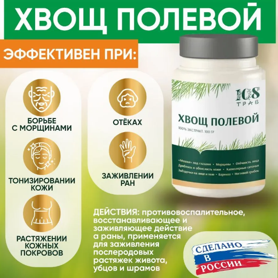Крем для лица и тела с экстрактом Хвоща полевого от бренда «108 трав» на основе пчелиного воска помогает от морщин век и лба, от отёчности, от мешков и кругов вокруг глаз. Главный компонент крема- экстракт хвоща богат по своему химическому составу, особенно витамином С, органическим кислотами и другими биологически активными веществами. Благодаря чему натуральный крем для мужчин и женщин выравнивает подкожный рельеф тканей, оказывает антимикробное, противовоспалительное, восстанавливающее и заживляющее действие на раны, применяется для заживления послеродовых растяжек живота, рубцов и шрамов.