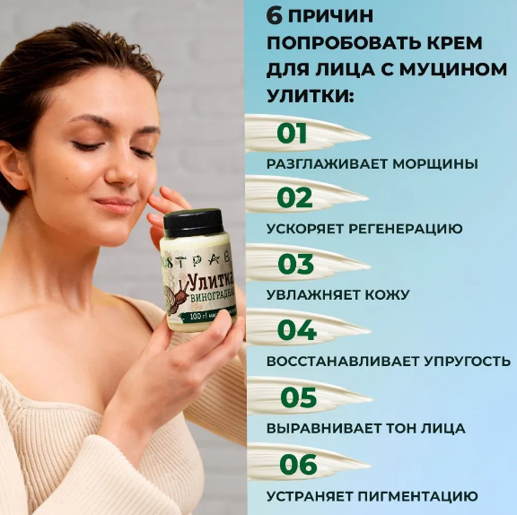 Благодаря своей способности ускорять обновление клеток эпидермиса муцин активно применяется в косметических продуктах, чья задача — бороться со шрамами и рубцами. Крем-эмульсия с секретом улитки поможет избавиться от постакне и воспалений.