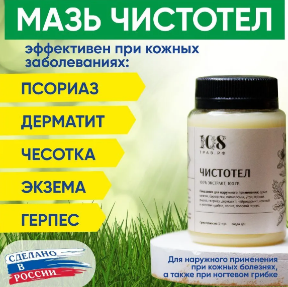 Мазь чистотела от бренда "108 трав" - это натуральное негормональное средство от грибка ногтей на ногах, которое помогает бороться с различными кожными заболеваниями. Мазь от псориаза обладает антибактериальным действием и предотвращает кожные инфекции, подходит для наружного применения и может использоваться на всех частях тела, включая гениталии. Чистотел от папиллом подходит как для мужчин, так и для женщин, а также для подростков. Чистотел от бородавки эффективно помогает лечить псориаз, дерматиты ( аллергический дерматит, контактный дерматит, себорейный дерматит, солнечный дерматит), лишай, раздражения кожи, экземы, угри, акне, везикул, нейродермит и другие кожные заболевания.