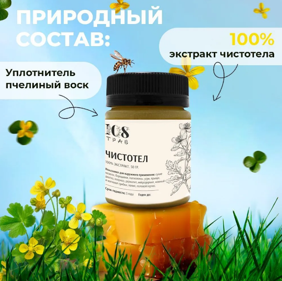100% масляный экстракт чистотела большого, загуститель пчелиный воск.