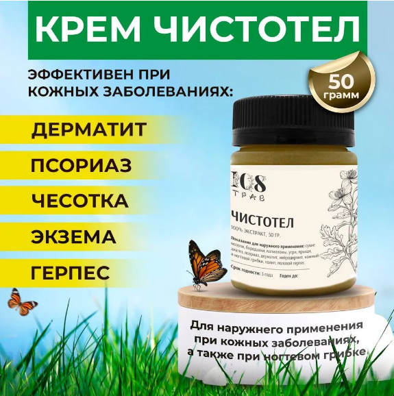 Крем для лица и тела Чистотел эффективно удаляет бородавки, папилломы и кандиломы, а также помогает лечить псориаз, дерматиты, экземы и другие кожные заболевания. Он подходит для наружного применения и может использоваться на всех частях тела, включая гениталии. Благодаря мощному противогрибковому действию крем чистотела легко справляется с кожным грибком и применяется от грибка ногтей на ногах. . Наружно чистотелом лечат тяжело заживающие раны, сухие мозоли, натоптыши, пяточные шпоры, выпирающие косточки на ступнях.
