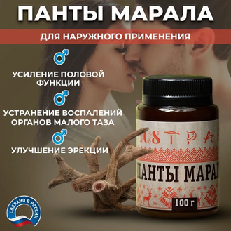 Крем-эмульсия панты марала для наружного применения это концентрат набора полезных веществ, извлеченных из неотвердевших рогов алтайского марала. Панты марала являются сильнейшим природным афродизиаком, значительно повышающим либидо мужчин, действует как виагра для мужчин, увеличивая кровенаполненность мужских органов способствуют долговременному повышению потенции и препятствуют воспалительным заболеваниям половой сферы. Крем - бальзам применяется для восстановления и усиления половой функции у мужчин и женщин, возбуждающее средство.