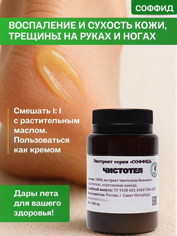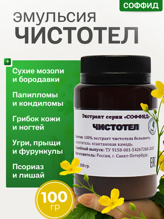 Применение: при бородавках - смазать любым растительным маслом, сразу сверху эмульсией чистотела, минимум через 20 минуть смыть; при угрях и прыщах - нанести на чистую кожу; при псориазе - смазывать по краям поражения кожи; при воспалении и сухости на ногах - смешать 1:1 с растительным маслом, пользоваться как кремом; при сухих мозолях - компресс на ночь; при кожно-ногтевом грибке - смазывать 2 раза в день, между процедурами максимум 12 часов; при пяточной шпоре - густо мазать 2 раза в день. Показания и применение приведены по материалам народной медицины.