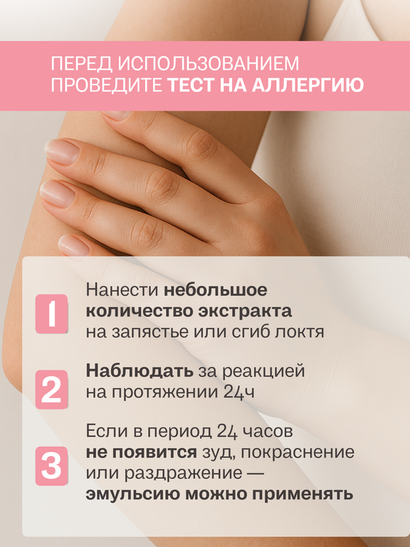 Применение: пользоваться как лосьоном 1-2 раза в день; на капиллярные изъяны - накладывать аппликации на 20 минут 1 раз в день. Необходимо сделать тест на аллергию: нанести небольшое количество экстракта на запястье, наблюдать за реакцией 24 часа, если в период 24 часов не появится зуд, покраснение или раздражение - эмульсию можно применять. Показания и применение приведены по материалам народной медицины.