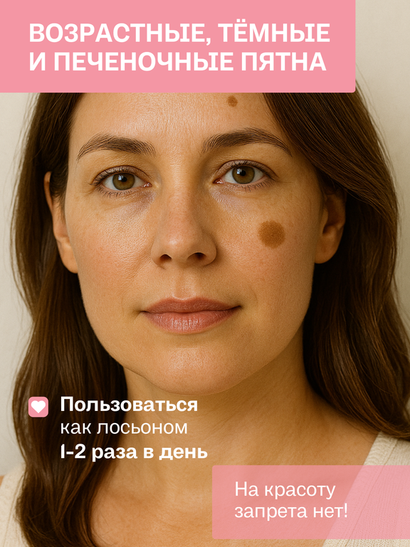 Показания: убирает печеночные, возрастные, пигментные пятна, укрепляет капилляры.