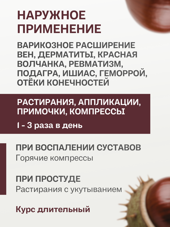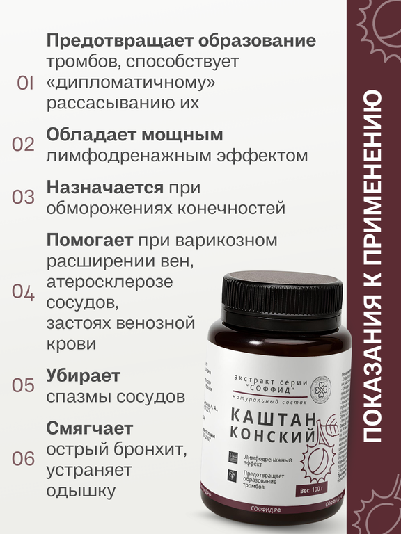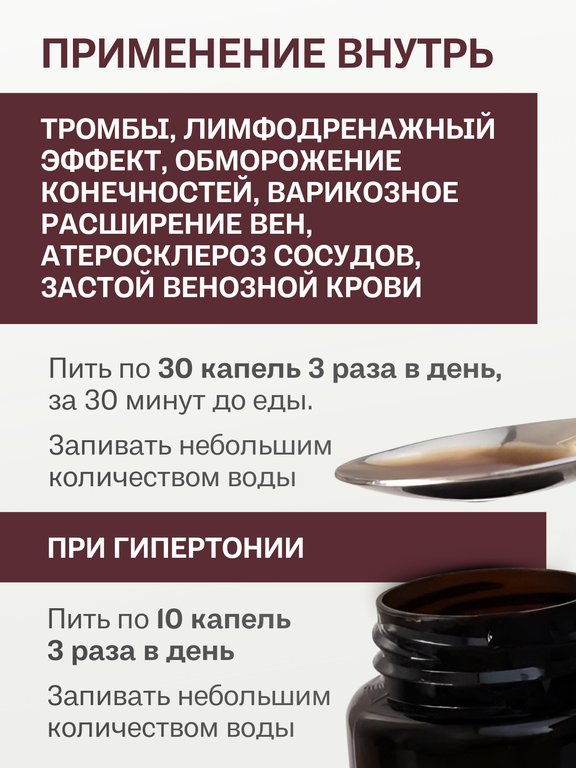 Показания: Рассасывает тромбы, атеросклероз сосудов, застой венозной крови. Нормализует артериальное давление, приводит в норму функцию желчного пузыря, снижает холестерин.