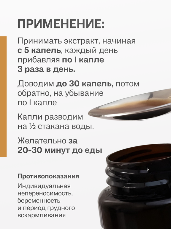 Применение: принимать экстракт, начиная с 5 капель, каждый день прибавляя по 1 капле 3 раза в день. Доводим до 30 капель, потом обратно, на убывание по 1 капле. Капли разводим на 1/2 стакана воды. Желательно за 20-30 минут до еды. Показания приведены по материалам народной медицины.
