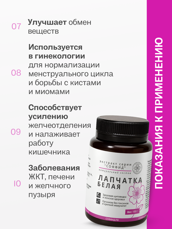 Показания: нормализует функционирование эндокринной системы и гормональный фон. Устраняет дефицит йода в организме, эффективно справляется с заболеваниями щитовидной железы. Способствует активному выведению из организма шлаков, токсинов, радиации, используется в гинекологии для нормализации менструального цикла и борьбы с кистами и миомами. Заболевания ЖКТ, печени, желчного пузыря.