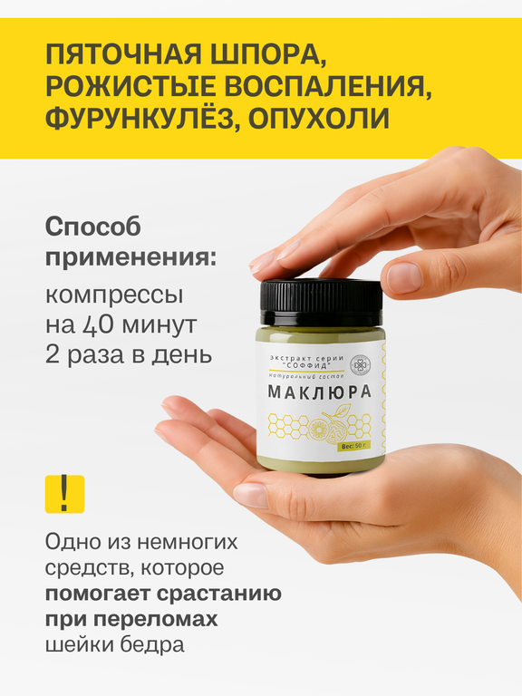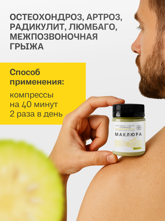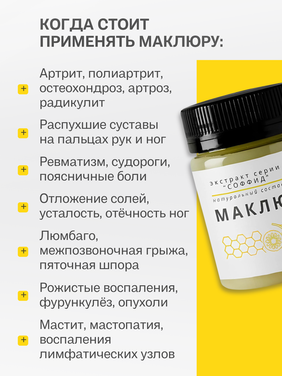 Показания: при боли в суставах в спине, снимает усталость и отеки, помогает при мастите, мастопатии. Стоит применять при артрите, полиартрите, остеохондрозе, артрозе, радикулите, распухших суставах, ревматизме, судорогах, поясничных болях, отложении солей, любмаго, межпозвоночной грыже, рожистые воспаления, фурункулез, опухоли, мастит, мастопатия, воспаление лимфатических узлов.