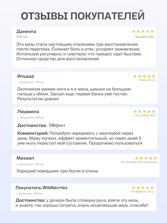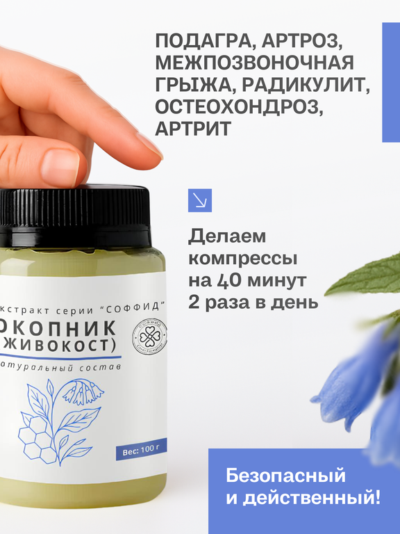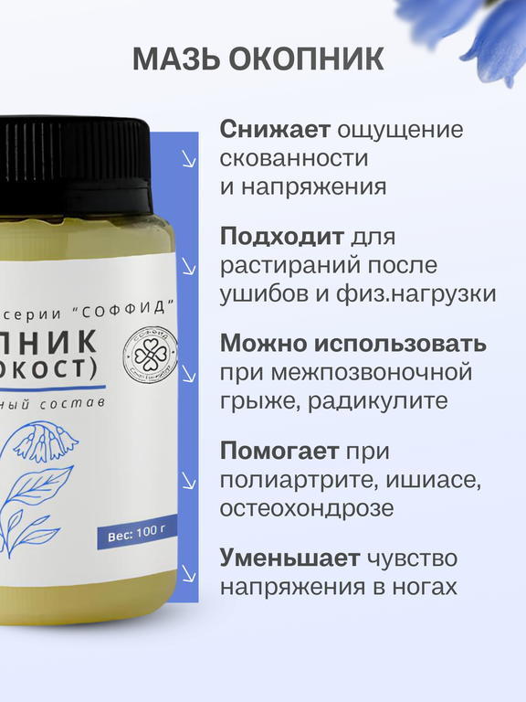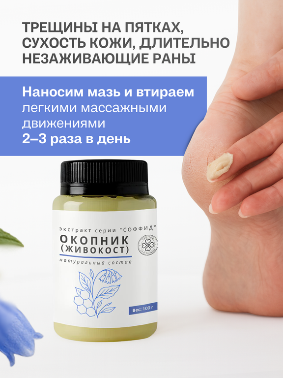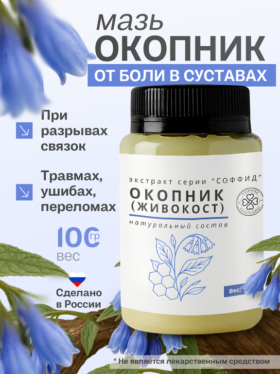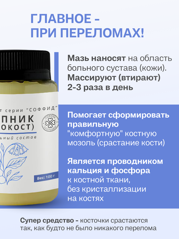 Показания и применения: Переломы, ушибы, растяжения связочного аппарата, разрывы связок, спортивные травмы, воспаления и боли в суставах, спине, улучшает кровообращение в околосуставных тканях, трещины, сухость кожи, длительно незаживающие раны и язвы, открытые раны: мазь наносят на область больного сустава, массируют (втирают) 2-3 раза в день.