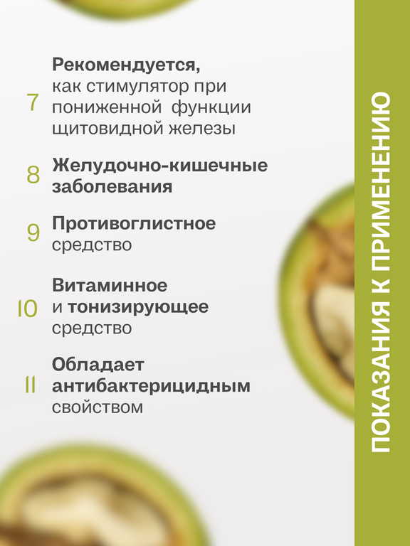 Показания: стимулирует работу головного мозга, улучшает память, самочувствие при сердечно-сосудистых заболеваниях, гипертония, склероз, атеросклероз, способствует снижению сахара в крови, понижает содержание жира в крови. Очищает организм от радиации. Рекомендуется как стимулятор при пониженной функции щитовидной железы. Желудочно-кишечные заболевания.