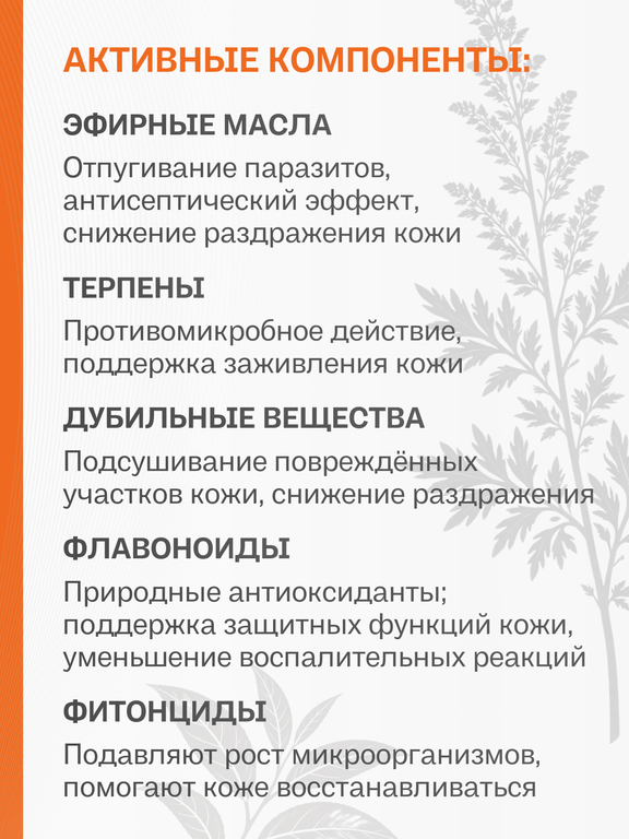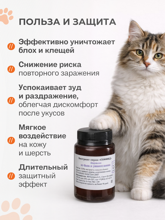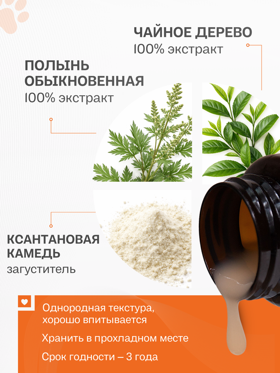 Показания: уничтожает блох и ушных клешей и других паразитов, успокивает ранки в местах укусов. Имеет антипаразитное свойство, противовоспалительное.