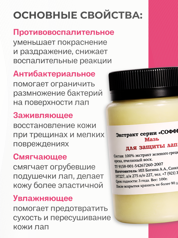 Показания: для защиты лапок, защита от трещин и сухости, устраняет раздражение и зуд, смягчение подушечек лап, поддерживание естественного состояния кожи.