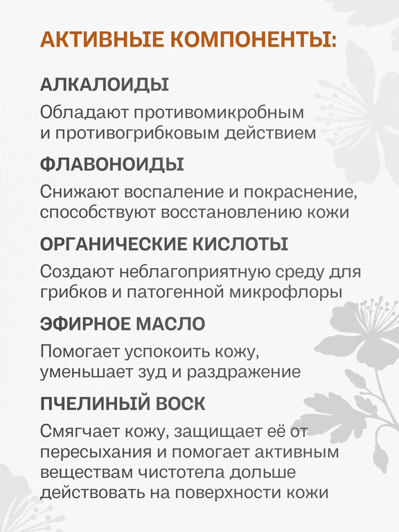Применение: втирать в проблемные участки кожи 1 раз в день. Показания приведены по материалам народной медицины.