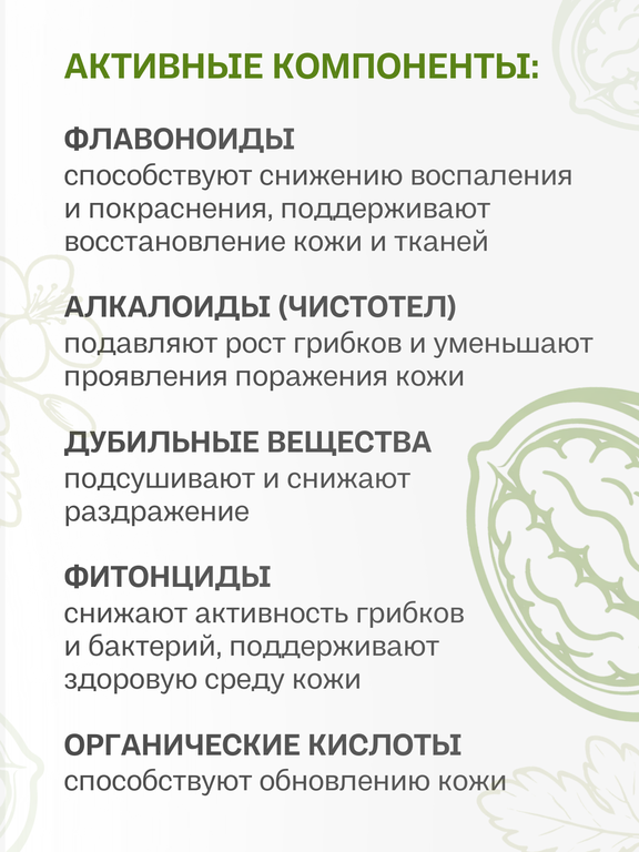 Показания: при кожных проблемах, грибковых проявлениях, снижает воспаление и раздражение, успокаивает кожу, смягчает и зашишает кожу, способствует регенерации ткани, подсушивает проблемные участки, уменьшает покраснения, сдерживает развитие бактерий и грибков, противопаразитарное свойство, восстановительное свойство, успокаивающее свойство.