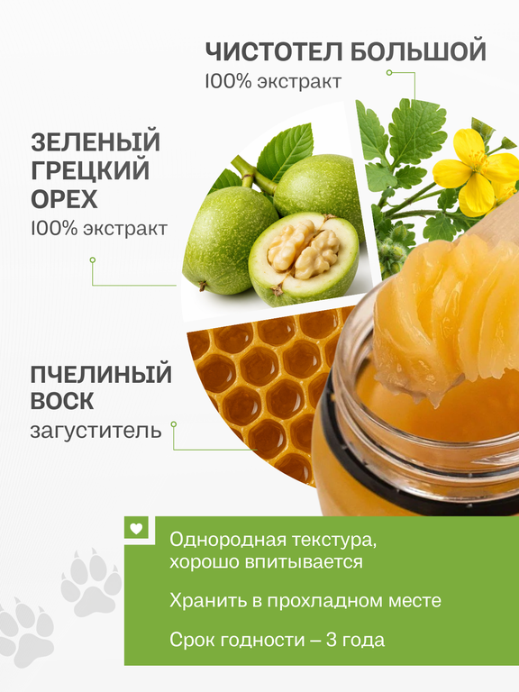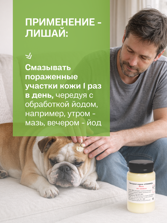 Применение: смазывать пораженные участки кожи 1 раз в день, чередуя с обработкой йодом, например, утром - мазь, вечером - йод. Показания приведены по материалам народной медицины.