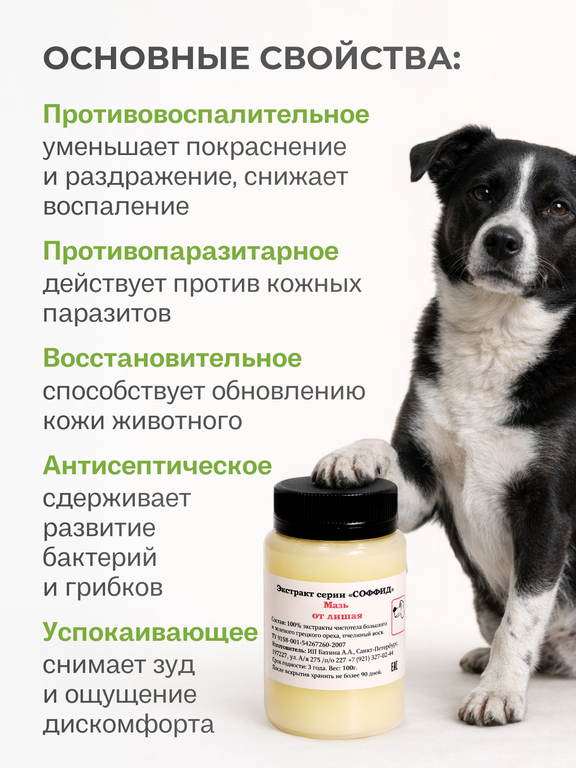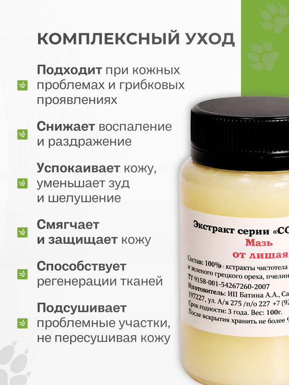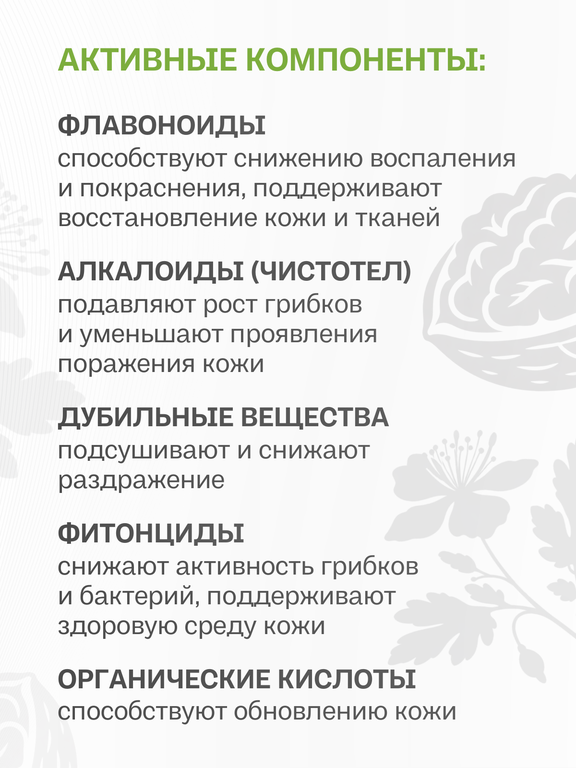 Показания: при кожных проблемах, грибковых проявлениях, снижает воспаление и раздражение, успокаивает кожу, смягчает и зашишает кожу, способствует регенерации ткани, подсушивает проблемные участки, уменьшает покраснения, сдерживает развитие бактерий и грибков, противопаразитарное свойство, восстановительное свойство, успокаивающее свойство.