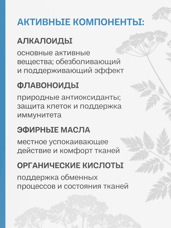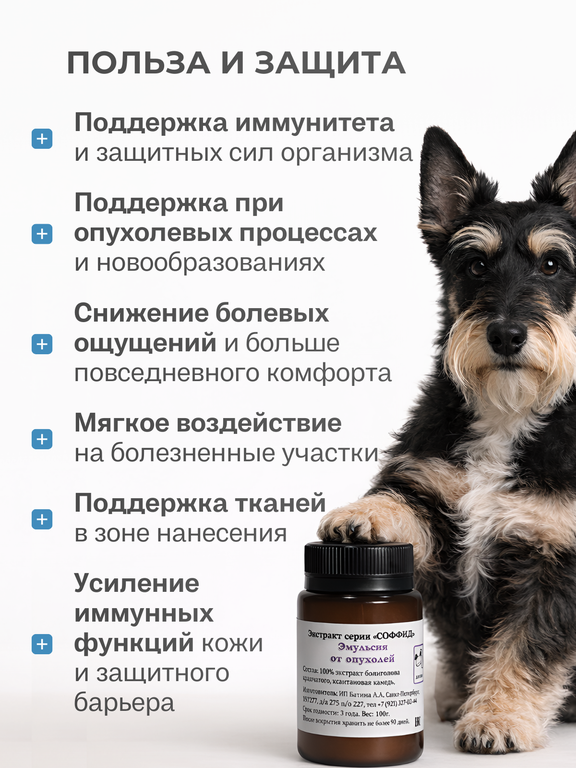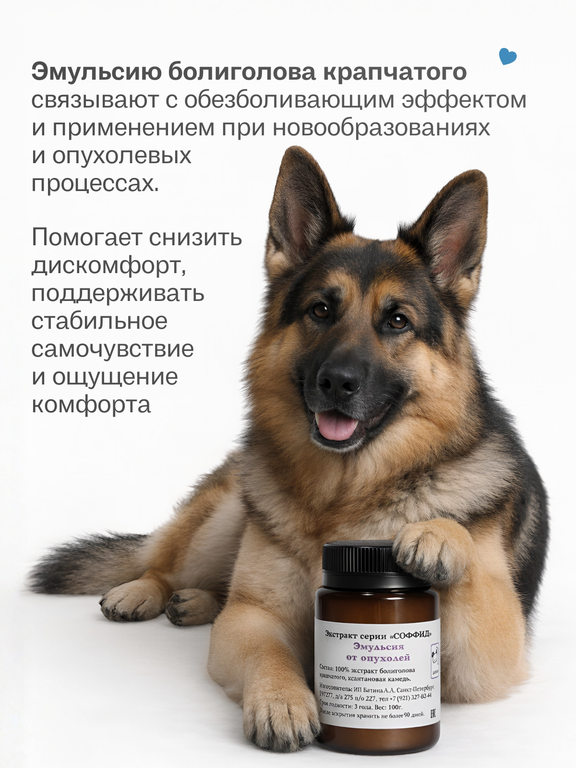 Показания: поддержка имунной системы, против опухолевых процессов, снижение болевых ощущений, поддержка тканей в зоне нанесения, усиление имунных функций, иммуномудлирующее свойство, обезбаливание, противовосполительное свойство.